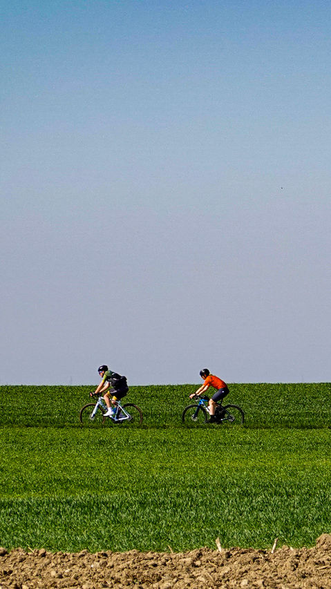 Od tego momentu jedziemy ostatnie 100 kilometrów wyścigu, dokładnie tym samym śladem co zawodowcy. Przed nami łącznie 19 sektorów brukowych – każdy inny, każdy wymagający. Bruk jest nierówny, często zapylony lub mokry, a otwarty teren sprawia, że wiatr staje się dodatkowym przeciwnikiem.